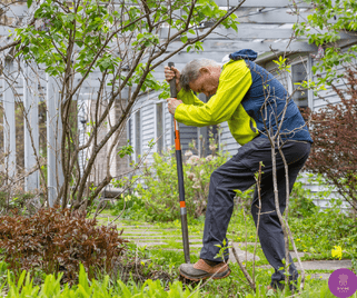Use the 30–30 rule—every 30 minutes of a task, pause for 30 seconds: stand tall, shoulder rolls x 5, hip hinge x 3, slow breath in/out. Alternate tasks (weeding → pruning → mowing) so one area doesn’t carry the entire load. When lifting bags or pots, hinge at the hips, keep the load close, and exhale on effort.